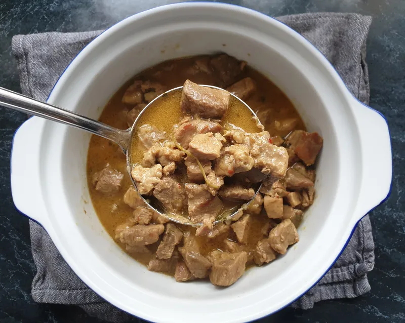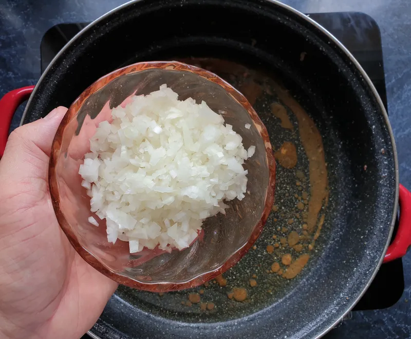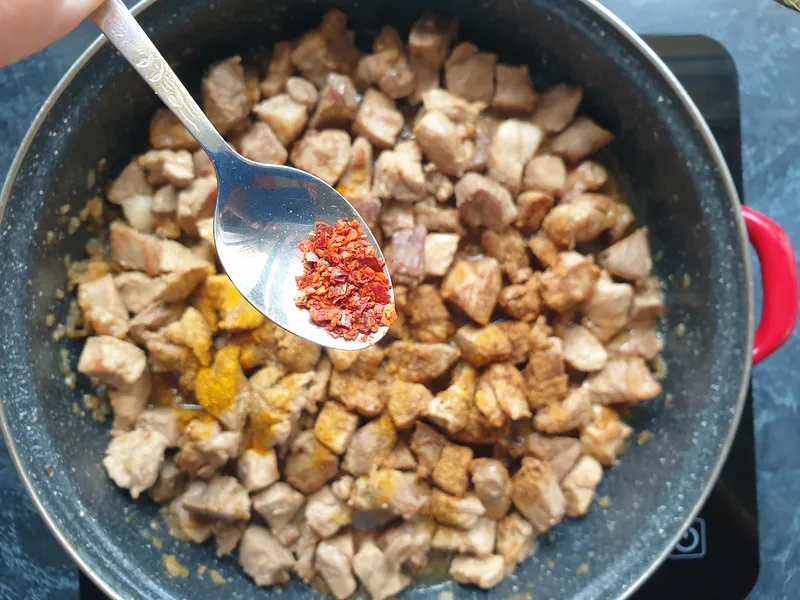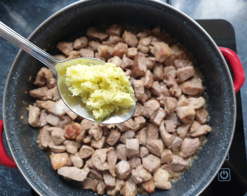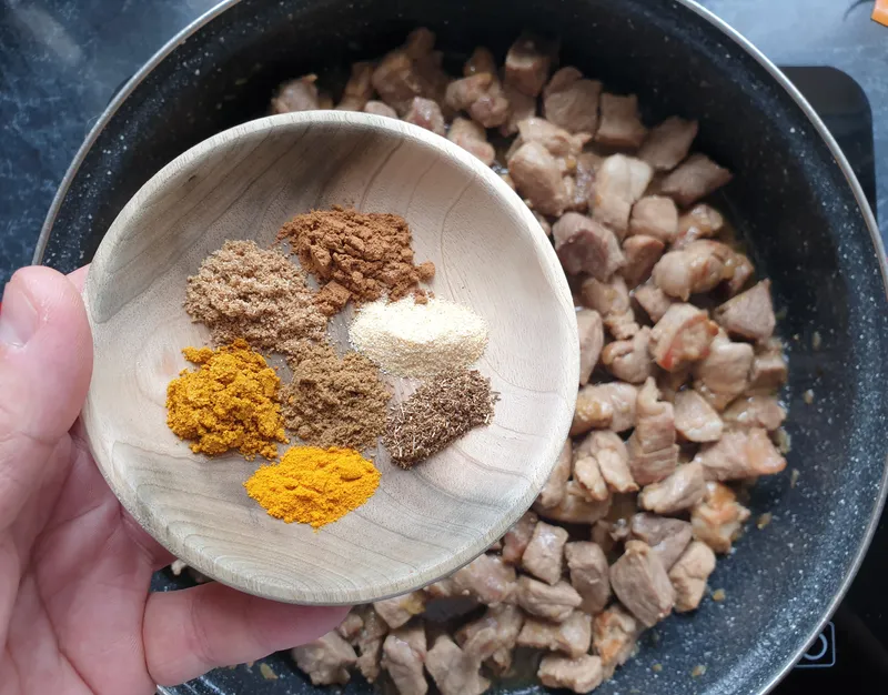 A megpirított húst félretesszük, majd a kisült zsiradékban ledinszteljük a finomra vágott hagymát.  Visszatesszük a húst, sózzuk. Belekeverjük a lereszelt gyömbért, majd hozzáadjuk a fűszerkeveréket és a chilit is.