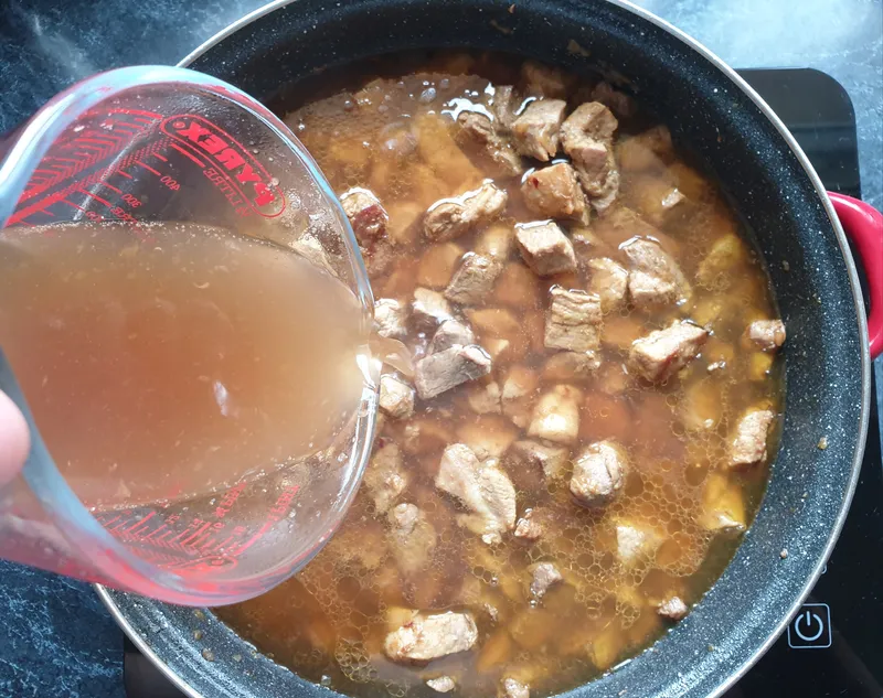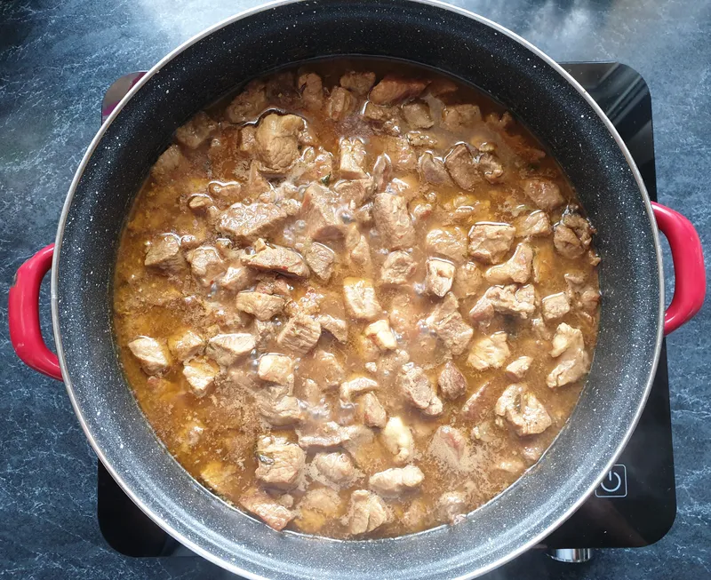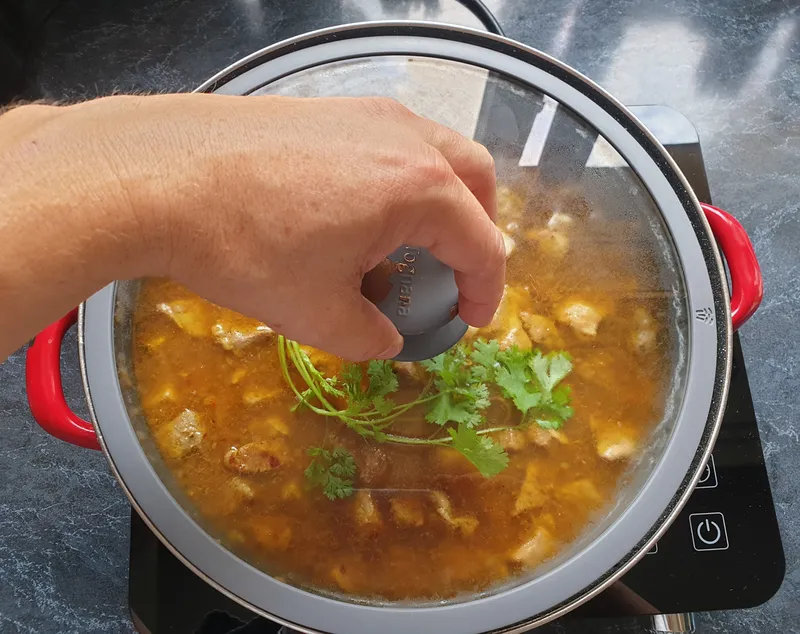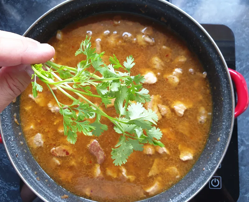Felöntjük az alaplével, beledobálunk 2-3 szál korianderzöldet, majd fedő alatt 1,5 órát főzzük.