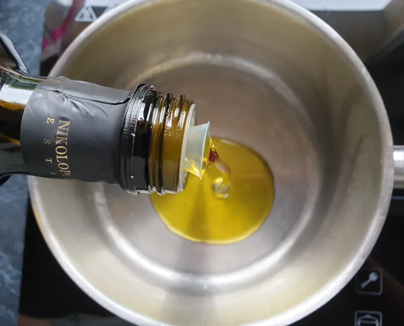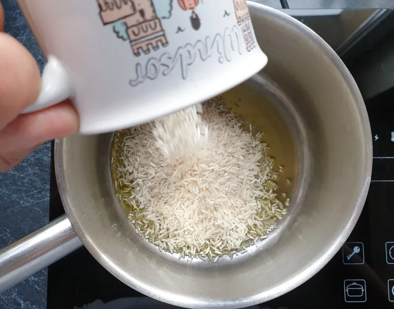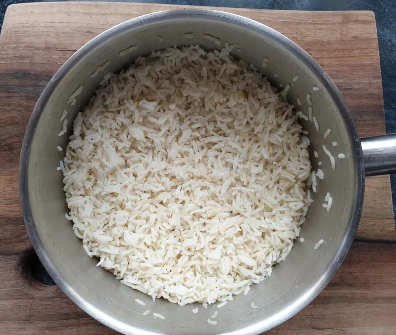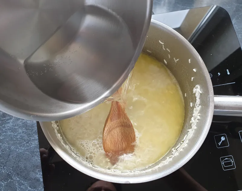 A rizst olívaolajon üvegesre pirítjuk. Sózzuk, majd felöntjük a forró vízzel. Jól letakarjuk, elzárjuk alatta a tűzhelyet, majd a lap melegén hagyjuk együtt kihűlni a rizst.