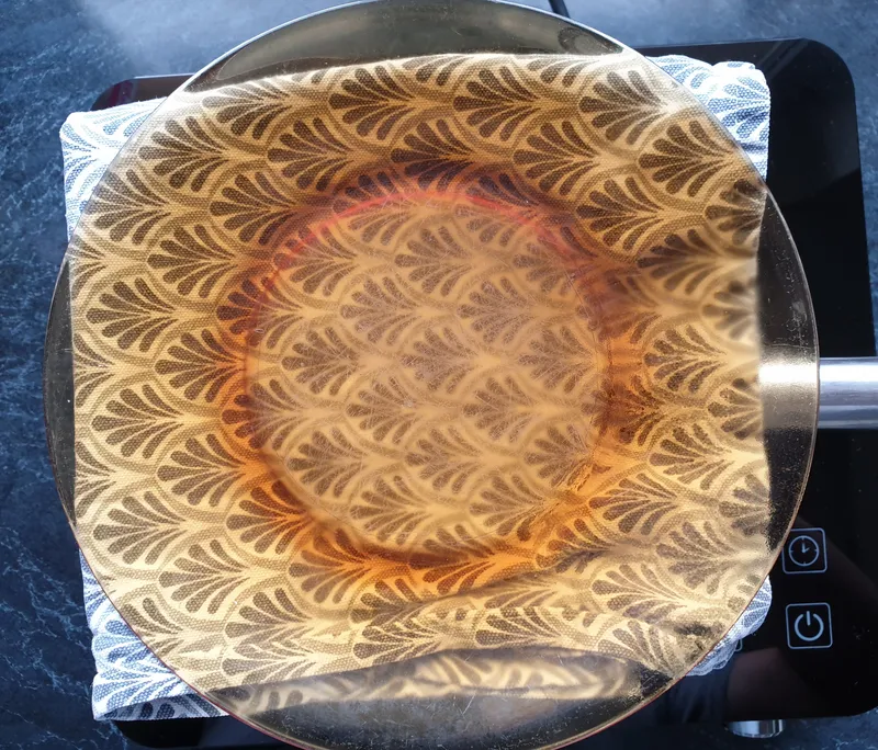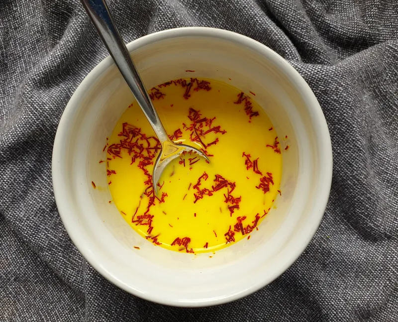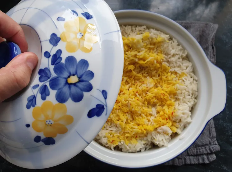 Rákanalazzuk a főtt rizst, majd a tetejére locsoljuk a sáfrányos rizst. Rátesszük az edény fedelét, és 160 fokos sütőbe toljuk, körülbelül 30 percre.