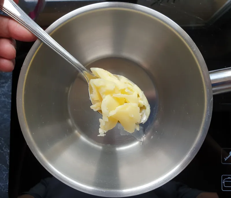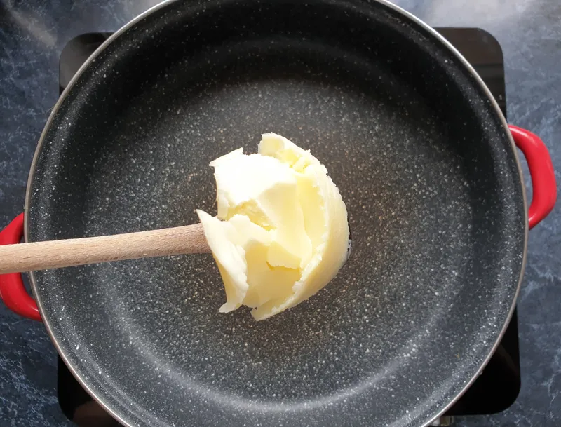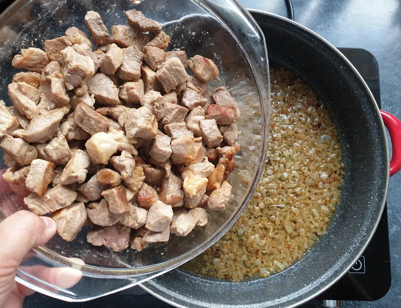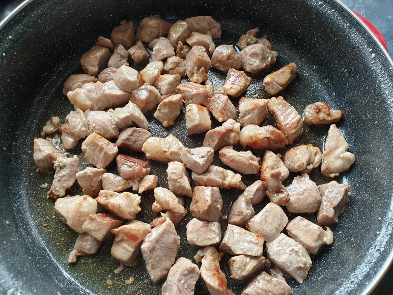 Egy tapadásmentes edényben felhevítjük a vajat. Két részletben beletesszük a felkockázott húst, kellemesen körbepirítjuk.