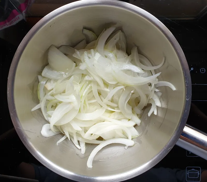 A hagymát vékony szeletekre vágjuk, majd lesózzuk, 5 percig pihentetjük.