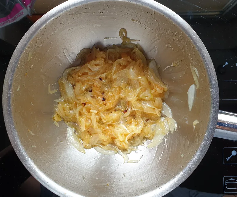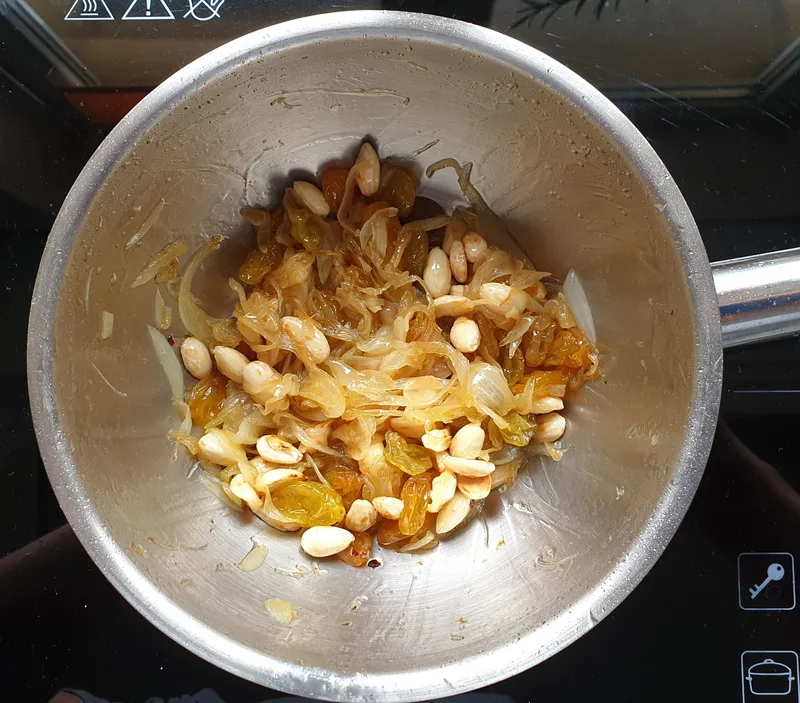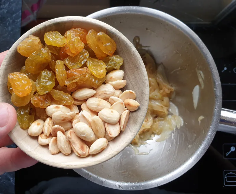 Felhevítjük a ghi-t, beletesszük a sózott hagymát, majd óvatosan elkezdjük főzni. Körülbelül 15-20 perc alatt szépen bebarnul, karamellizálódik. Beleforgatjuk a mandulát és a mazsolát, felhasználásig félretesszük.
