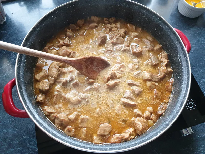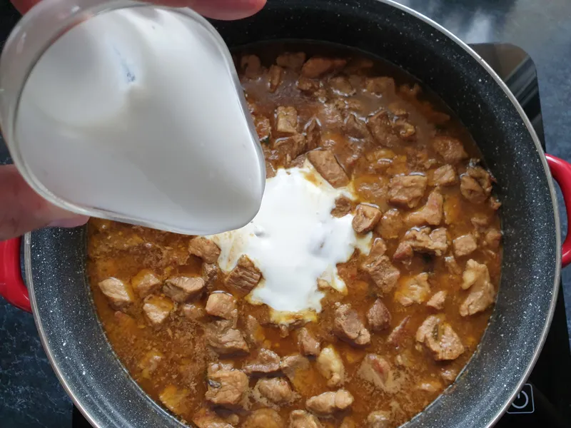 Miután eltelt a másfél óra, belekeverjük a húsraguba a joghurtot, majd átöntjük egy hőálló edénybe.