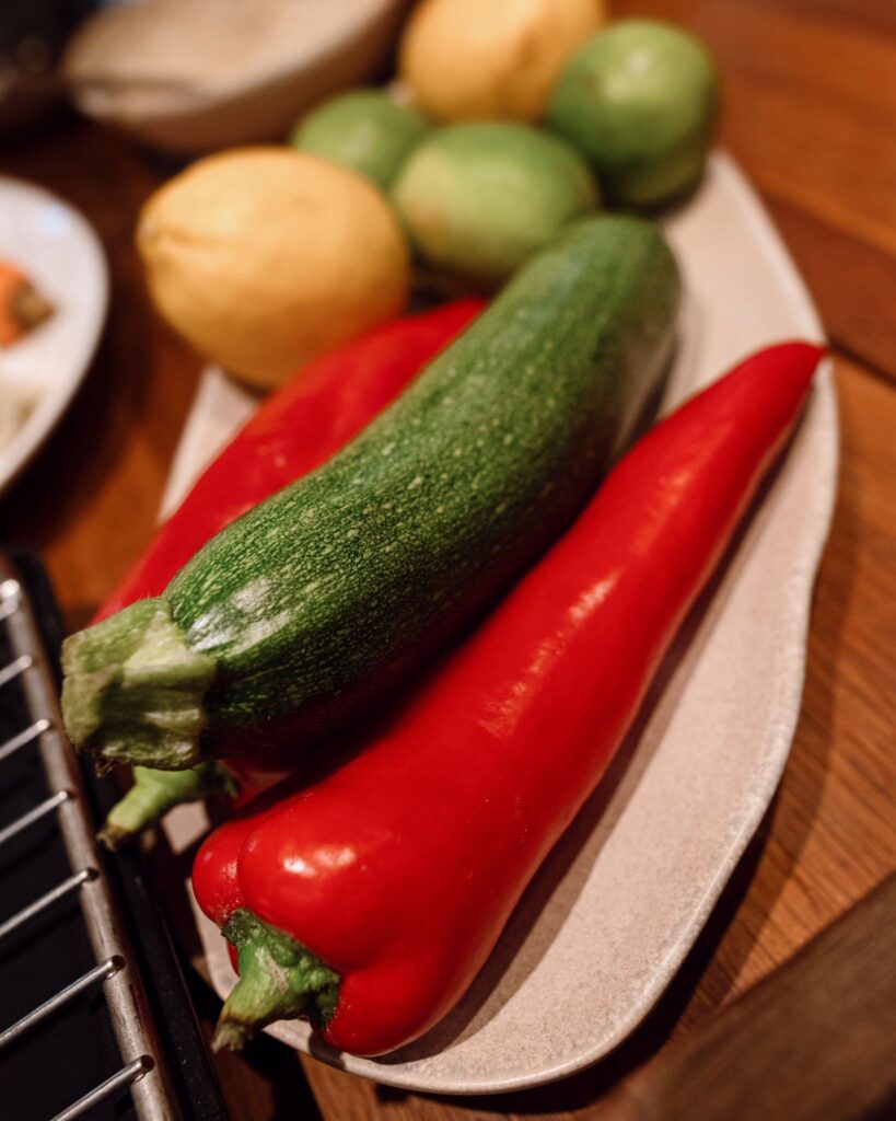 Köretnek 1 db grillezett cukkinit és 1 db kápia paprikát grillezve elkészítünk, amíg a hús megsül.