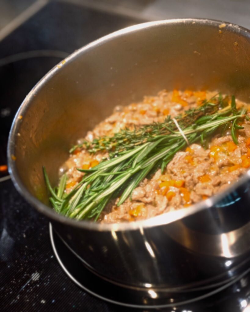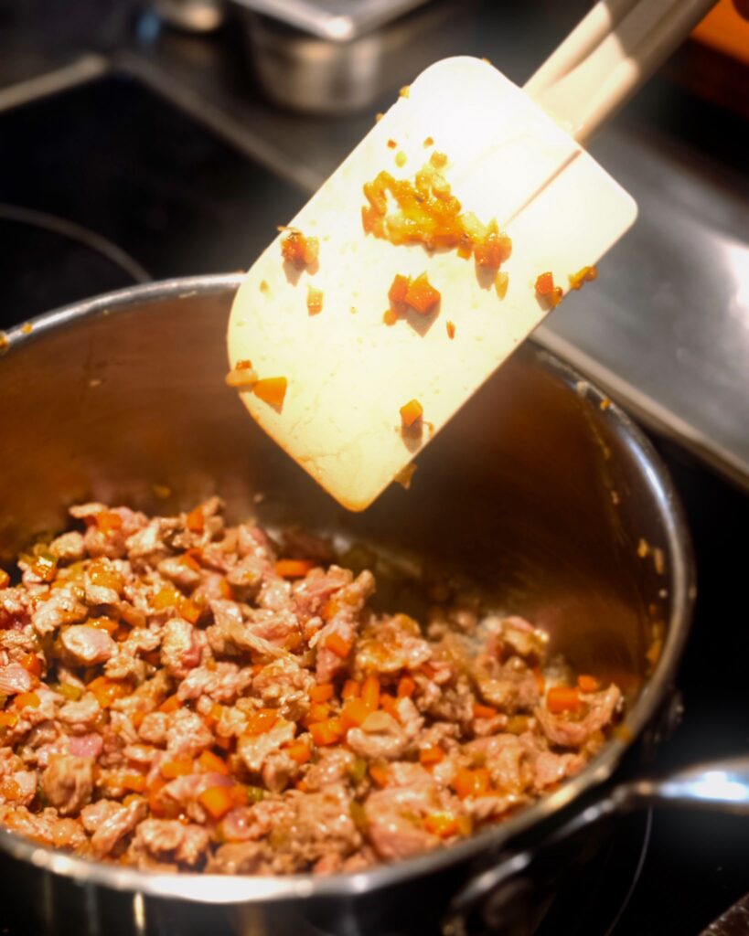 Kevés olívaolajon vagy szalonna zsíron vastag serpenyőben lepirítjuk a darált, vagy apró kockára vágott báránycombot/lapockát. Pirítás után kivesszük a húst egy tálba. Soffritto alapot készítünk, azaz apró kockára vágott sárgarépát, hagymát, angolzellert pirítunk és párolunk az említett serpenyőnkben.
