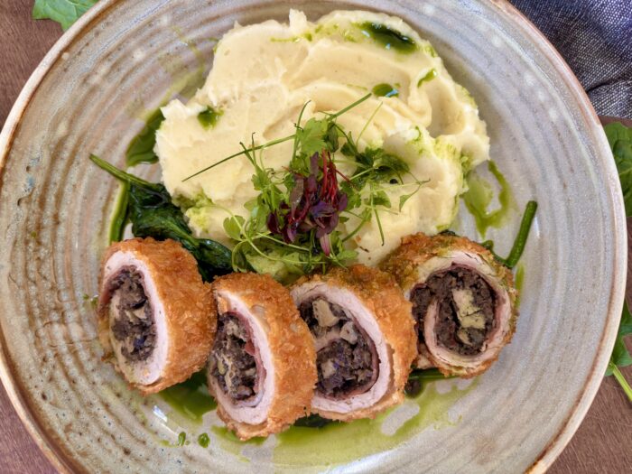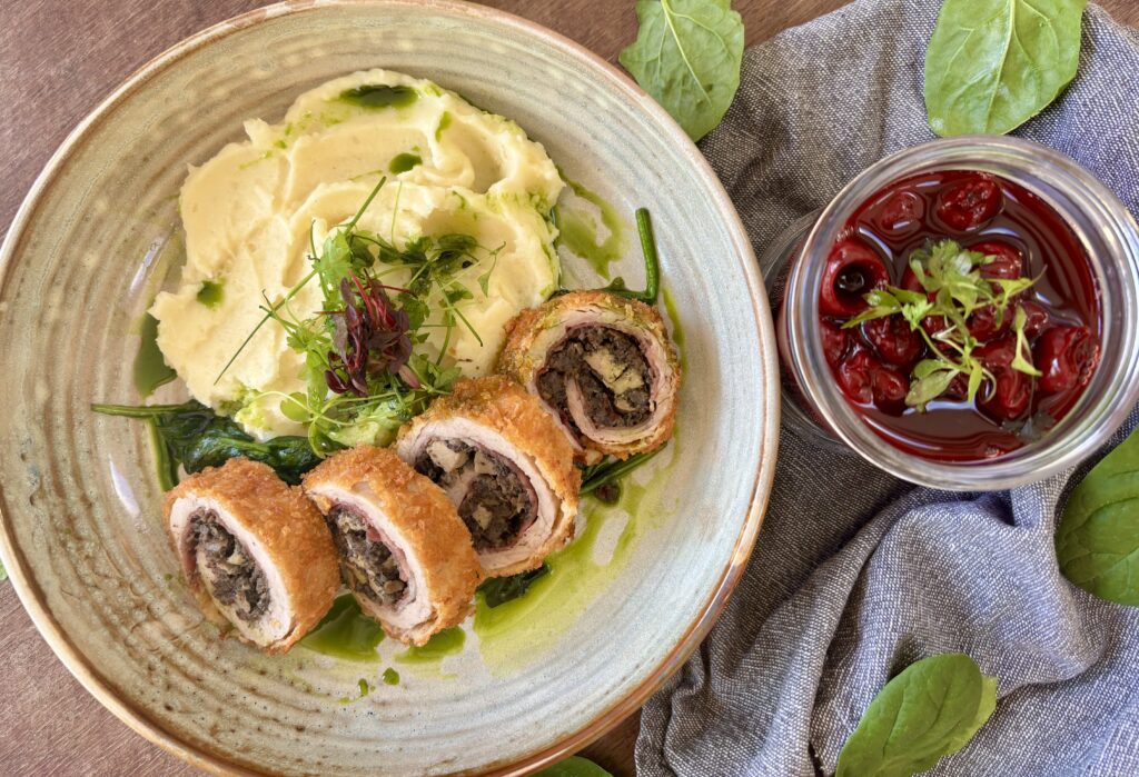 A kilapított húst enyhén sózzuk, majd ráfektetjük a sonkaszeleteket. Erre vékony rétegben rákenjük a gombapépet. A közepére néhány darab libamájat helyezünk, majd a két oldalán kicsit visszahajtva szorosan feltekerjük. Fóliába tekerjük, és felhasználásig hűtőben pihentetjük.
