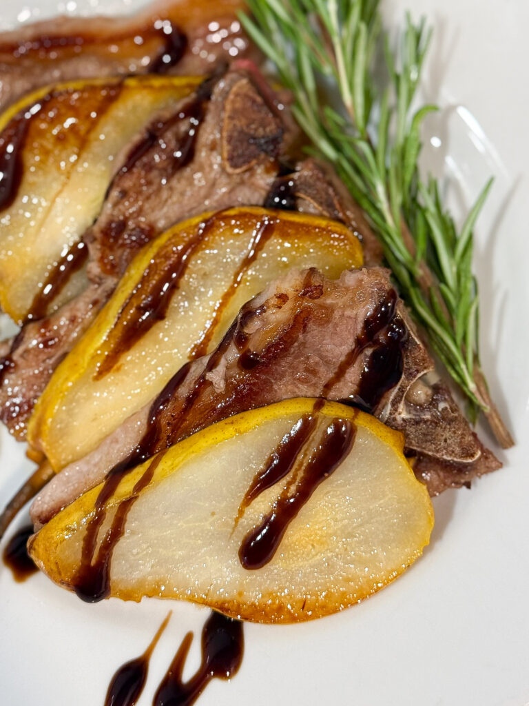 A báránykarajt helyezd a tányérra a karamellizált körteszeletekkel. Locsold meg balzsamecettel.