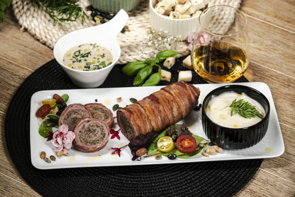 Ha szeretnél valami igazán ünnepit készíteni, ami egyszerre látványos és ízgazdag, akkor ez a skót ihletésű bárányétel biztosan elnyeri a tetszésed. A szaftos, fűszeres töltelékkel megkent báránykaraj baconbe göngyölve készül, így minden falatban találkozik a hús karakteres íze a pirult bacon füstös ropogásával. A kísérője sem akármilyen: krémes, enyhén karamellizált sült karfiolpüré és egy bársonyos whisky mártás, amely egyszerre elegáns és telt ízeket ad az ételnek.